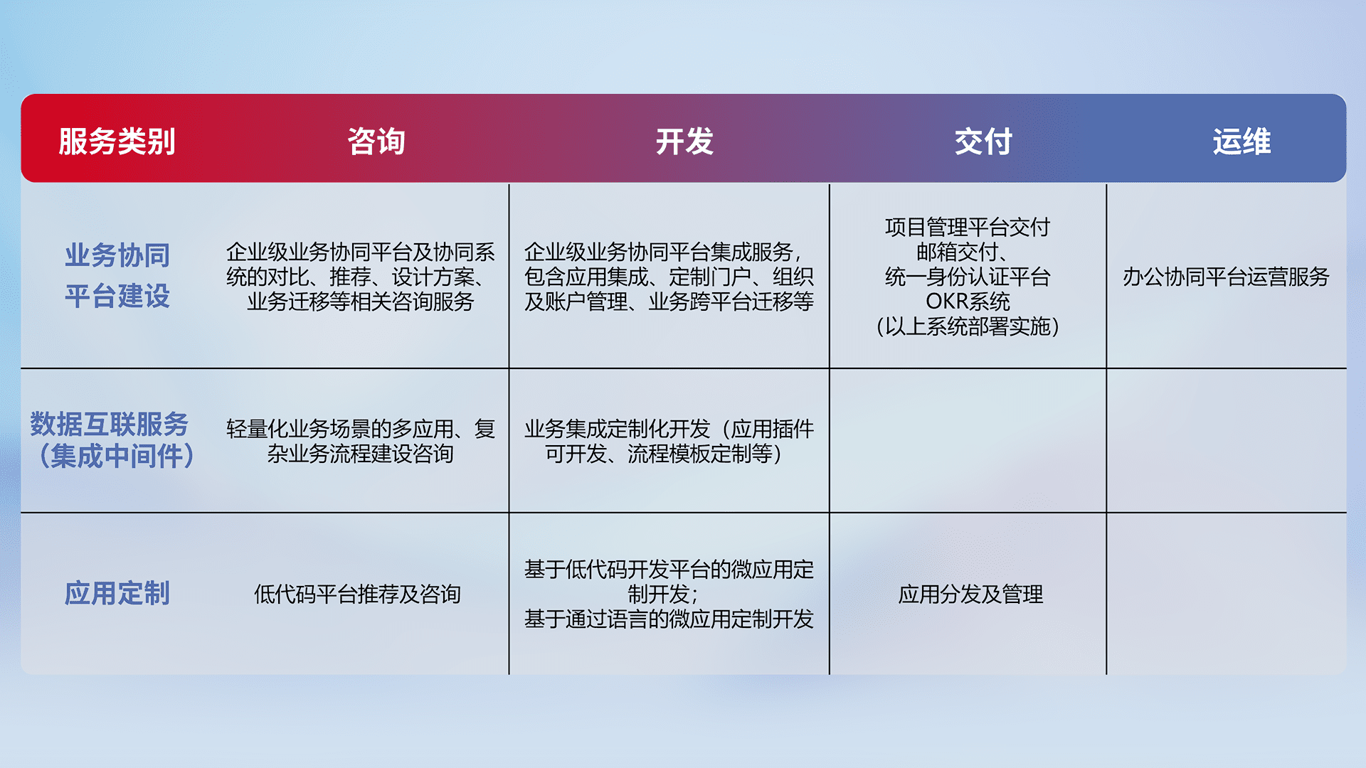 针对钉钉、、、企微、、、IDaas等平台级产品提供产品的规划、、、、方案、、交付、、、、定制化开发等服务,,实现如统一协同办公、、、、智能客户服务、、、混合会议管理、、、智能数据查询、、、等业务场景,,,,实现数字化转型。。。